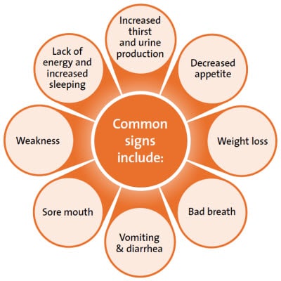 Common signs of kidney failure in cats may be difficult to detect because of their similarities to other disorders like diabetes and hyperthyroidism. Unfortunately, kidney failure is a progressive disease, and symptoms may not be apparent for a long time.