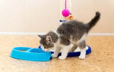 Your vet can advise you on whether dry and/or wet food is best for your kitty, but avoid supplementing or "wetting" your kitten's food with milk. It can upset their digestive system and may cause diarrhea.