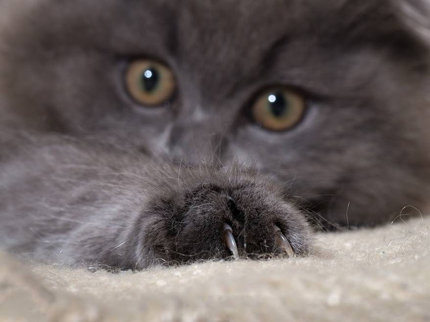 When deciding how far to cut your cat's claws, do not cut too close to the "quick," which is the pink part of the claw that houses the blood vessels and nerve endings. Cutting the quick is what causes bleeding and pain. If you do cut the quick, the Princeton Veterinary Hospital advises to rub a small dab of cornstarch or flour on the claw and apply pressure to help clot and stop the bleeding. At this point, it's best to abandon the effort for the day and let your cat recover emotionally.
