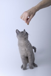 Before long, you'll notice your kitten will go into the sit position when you sweep your hand in an upward movement, even without food. Gradually phase the food out, but continue to say "Good kitty" when your kitten sits.