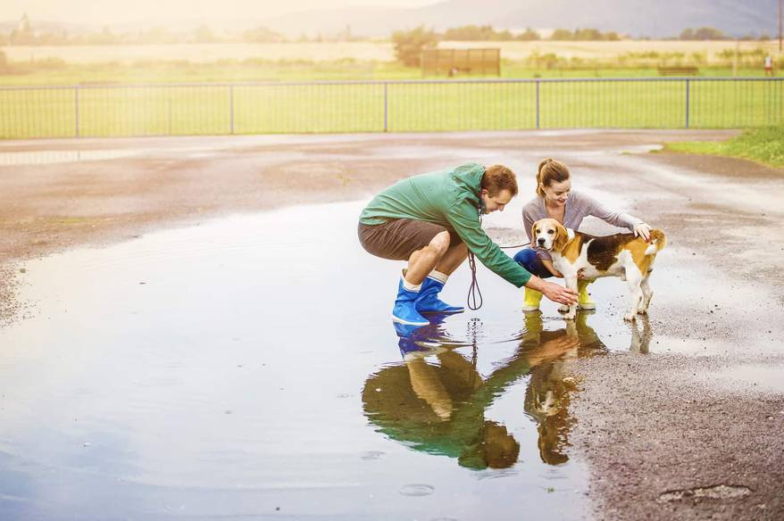 The best way to encourage your dog to get comfortable with the weather is to expose him to it at a young age. Your behavior and actions will influence your pet's; if he sees that you're having a good time, he may follow suit. However, not all puppies are properly introduced to inclement weather, and if you've adopted an older dog, you'll need to approach this differently.